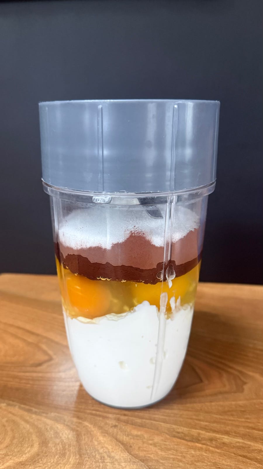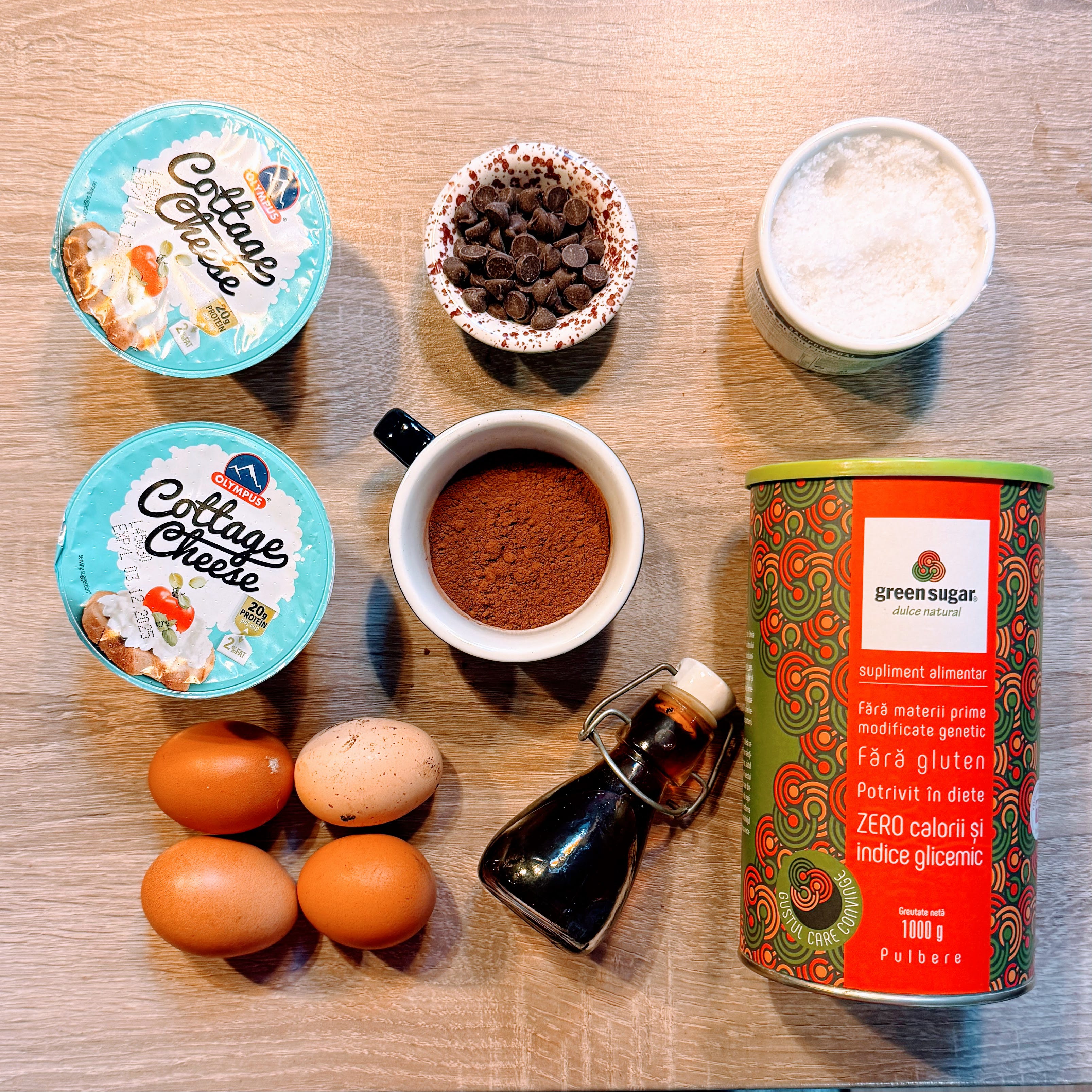 Am pus în vasul blenderului brânza cottage, ouăle și extractul de vanilie, pudra de cacao, îndulcitorul și sarea, și am 1-2 minute, până am obținut un amestec foarte omogen.